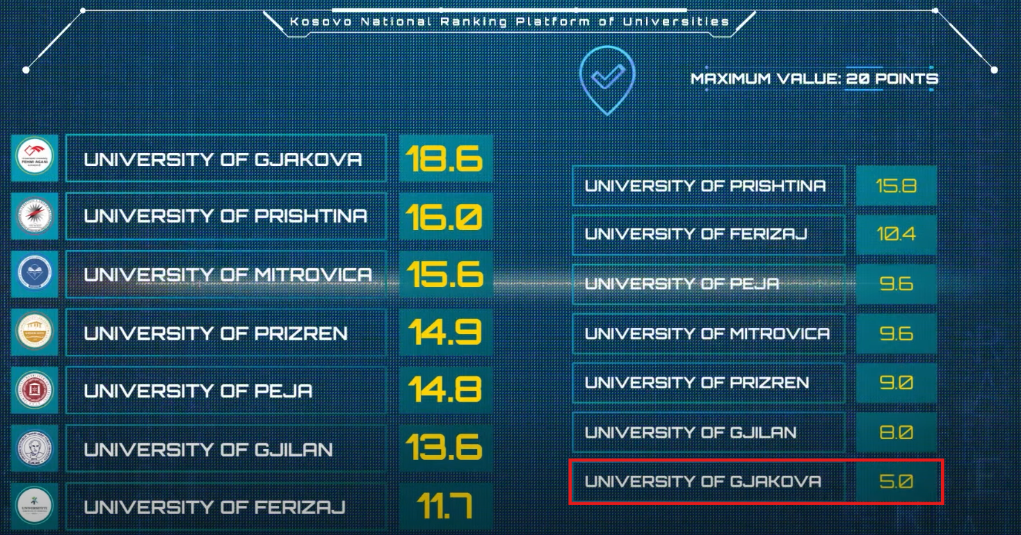 Po ashtu, më 26 shtator 2025, organizata ORCA ka publikuar raportin e saj vjetor për rangimin e universiteteve publike në Kosovë, ku UFAGJ është radhitur në vendin e katërt në nivel vendi, bazuar në pesë kategori kryesore të vlerësimit: transparencën institucionale, barazinë gjinore, raportin student–profesor, akreditimin e programeve dhe justifikimin e titujve akademikë.
