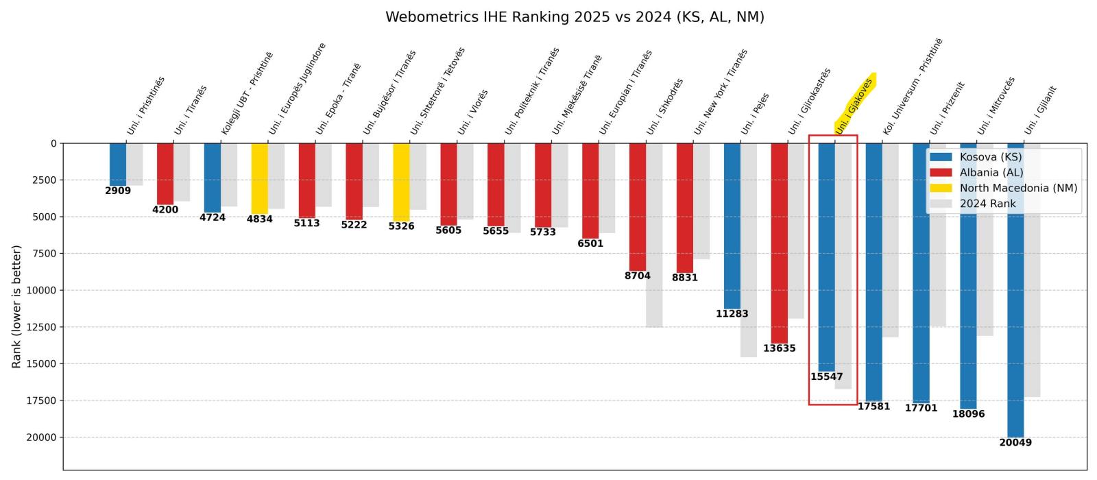 Universiteti “Fehmi Agani” në Gjakovë (UFAGJ) gjatë dy viteve të fundit po dëshmon progres të vazhdueshëm në ngritjen e cilësisë akademike dhe menaxhimit institucional. Në periudhën e fundit, UFAGJ është renditur si Universiteti i tretë publik në Kosovë sipas vlerësimit ndërkombëtar të Webometrics.com (pozita 15547), një ndër platformave më të njohura për matjen e performancës së institucioneve të arsimit të lartë.