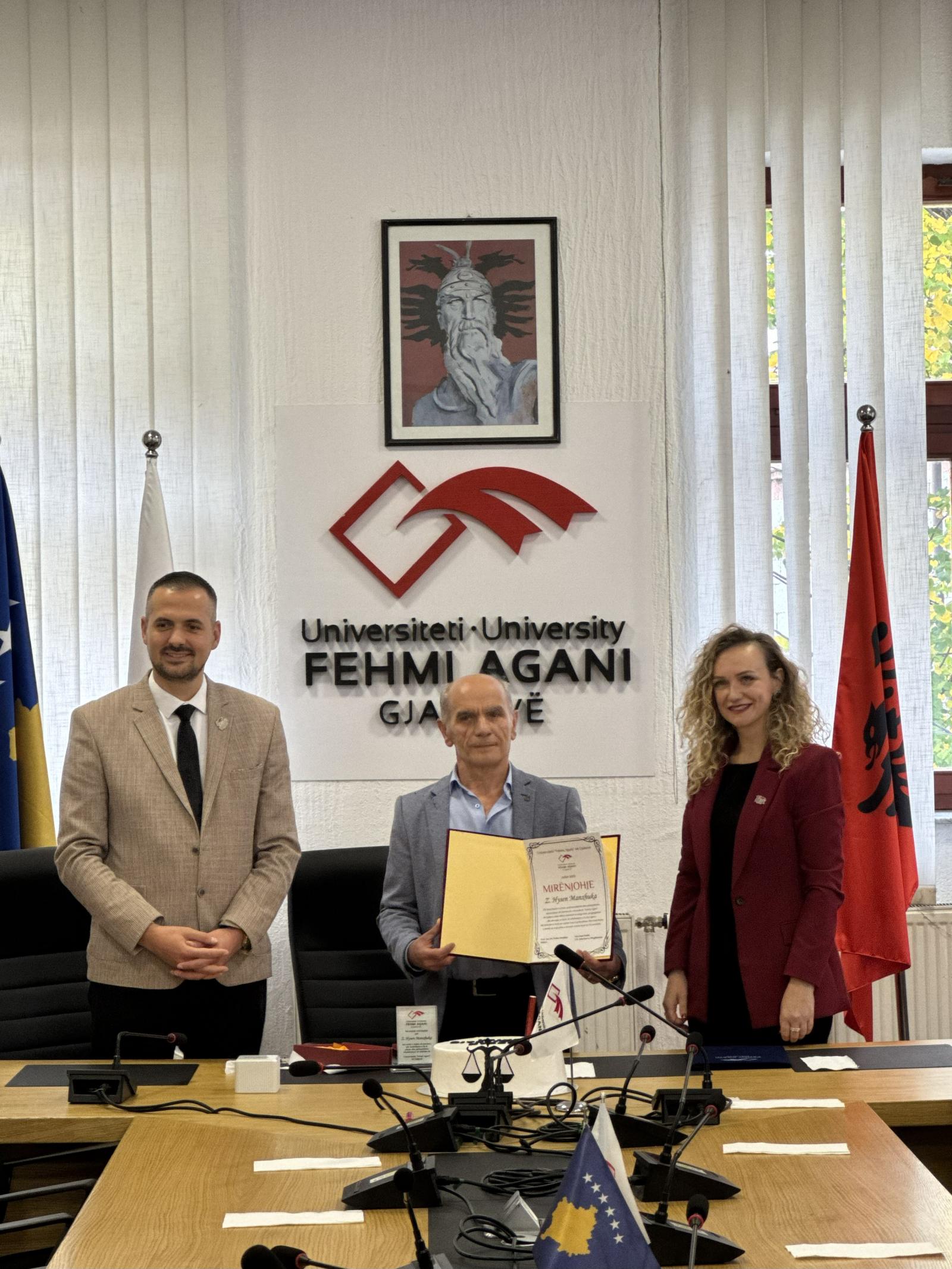 Në shenjë falënderimi për përkushtimin dhe kontributin e dhënë gjatë gjithë karrierës, Universiteti “Fehmi Agani” në Gjakovë i ndau z. Hysen Manxhuka Mirënjohje, si vlerësim për profesionalizmin, përgjegjësinë dhe integritetin e treguar në shërbim të institucionit.