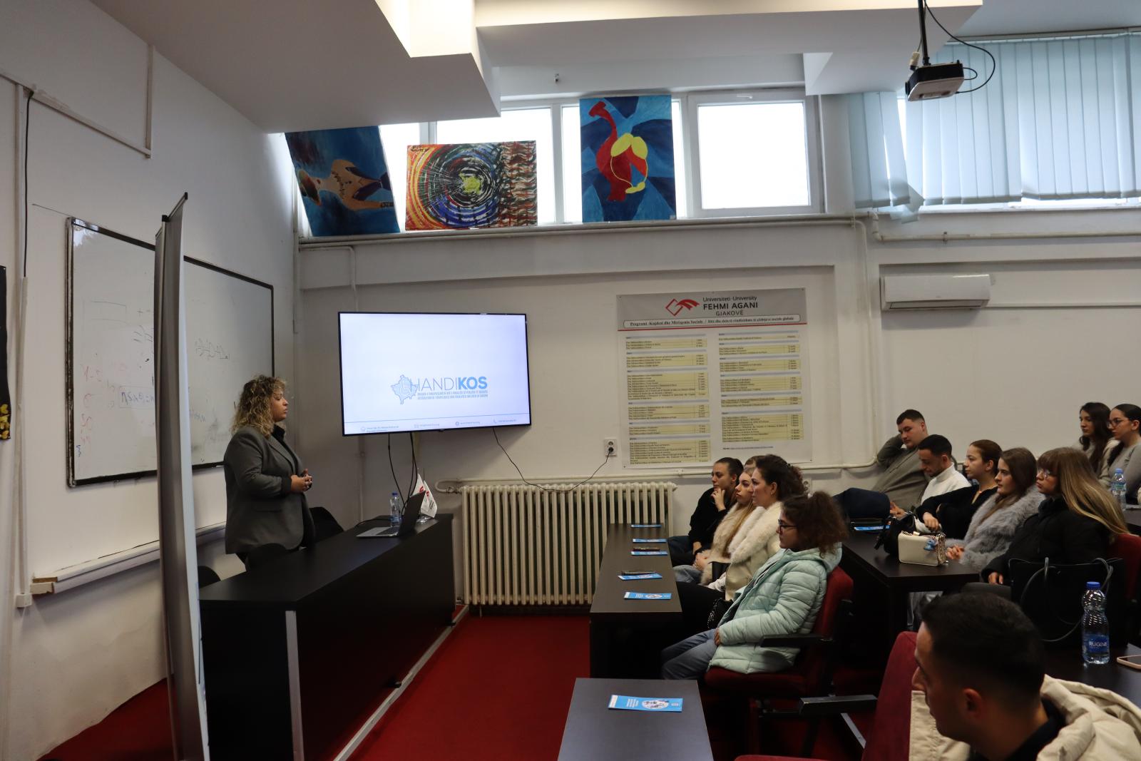 Gjatë sesionit, përfaqësuesja e organizatës HANDIKOS prezantoi aktivitetet, objektivat dhe mundësitë që ofron projekti EIHE, i cili synon nxitjen e përfshirjes, barazisë dhe praktikave gjithëpërfshirëse në institucionet e arsimit të lartë. Pjesëmarrësit u informuan për fazat e implementimit të projektit, rezultatet e pritura, si dhe rolin që Universiteti “Fehmi Agani” do të ketë në këtë iniciativë të rëndësishme.